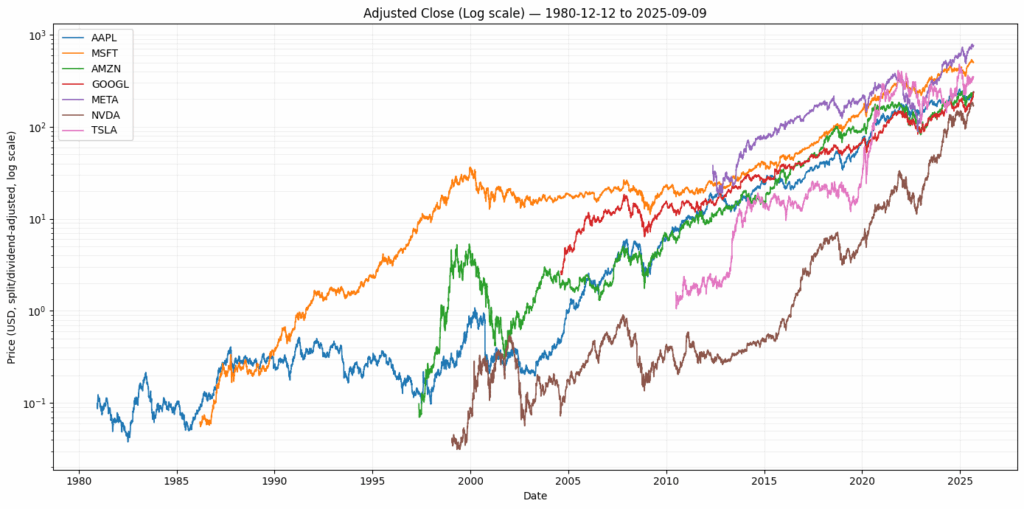股市投資, 就是進行產業分析 ~ 人生有幾個十年? 看對趨勢就有機會Level Up等級提升 美股七雄從上市以來的股價走勢 (已考慮拆股還原股價) [資料來源] Grok 3 +Colab, 2025-09-10 #價值投資 上一 文章 時間是多頭的朋友 下一 文章 認識一下厲害的投資基金